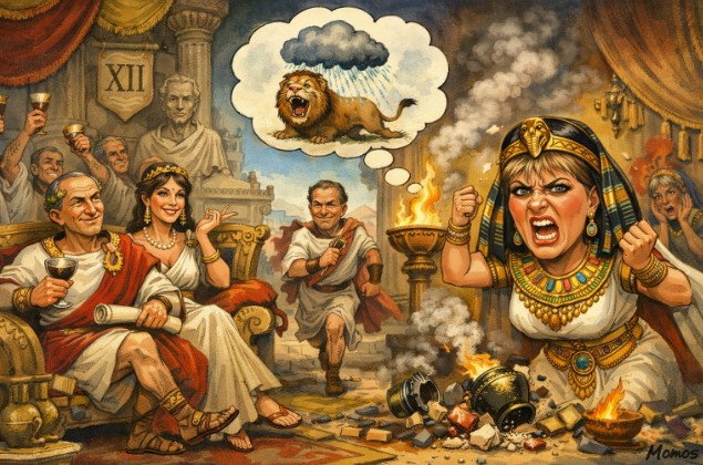 «Ricorderai, caro, che il mese di marzo non è fausto. E che tu stesso avevi suggerito a qualche senatore di consigliare alla regina Cleopatra di defilarsi dall’agone. Ma lei non ha ascoltato. Le ancelle mi dicono che l’hanno vista su e giù per il Foro, a convincere e blandire ogni cittadino. Poco stile, come al solito».