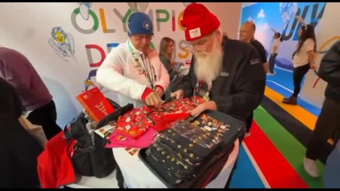 “Colleziono spille dalle Olimpiadi del 1984, ne ho migliaia e migliaia. I miei temi principali sono Olimpiadi e Coca-Cola. Tutte le persone che sono qui dimostrano che anche l’Italia si sta appassionando al fenomeno, ma devono ancora imparare. Io sono del Team Babbo Natale, che è senza confini, senza politica, solo tifo, tutti qui si qualificano e vincono”, racconta questo simpatico collezionista americano.