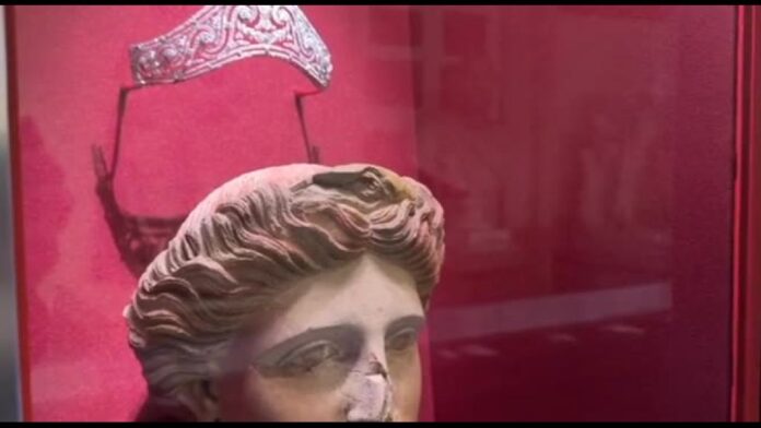 Miti, divinit, disegni, motivi e ornamenti che si ritrovano in collane e bracciali, come il mosaico delle colombe, il vello d’oro. Con minuziosi calchi e disegni che ricostruiscono il processo di lavorazione dei gioielli. All’ingresso il busto di Livia ha una corona come la Dea dell’abbondanza Cerere, e accanto c’ un diadema Cartier di inizio ‘900, di platino e diamanti che riprende il tema delle spighe di grano.