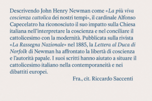 «La più viva coscienza cattolica dei nostri tempi». Con queste parole il cardinale Alfonso Capecelatro descriveva l’opera di John Henry Newman, riconoscendone il ruolo nella formazione di una cultura cattolica capace di dialogare con la modernità. Arcivescovo di Capua e studioso oratoriano, Capecelatro fu tra i primi a diffondere in Italia il pensiero del grande convertito inglese, pubblicando nel 1859 il volume Newman e la religione cattolica in Inghilterra.
