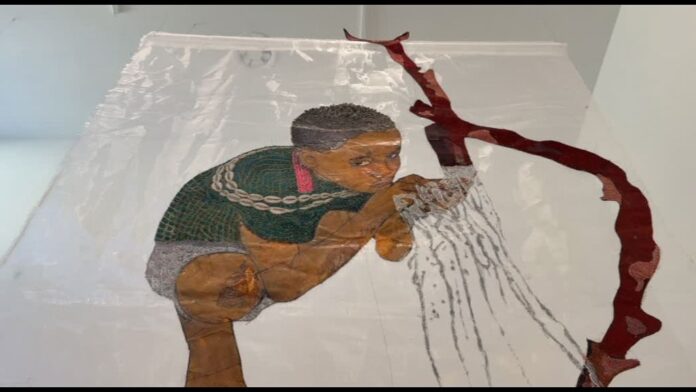 Per la produzione dei suoi lavori, Silva affida in una prima fase i soggetti da lei ideati e disegnati a ricamatori angolani in Angola solo agli uomini è consentito utilizzare la macchina da cucire – per poi ultimare lei stessa le opere, aggiungendo a mano decorazioni, glitter e paillettes. Nei lavori realizzati fra il 2021 e il 2023 visibili nella seconda sala della mostra l’artista utilizza borse di plastica intrecciata accumulate e dimenticate. Ana Silva trasforma quelli che sono diventati rifiuti di un sistema globale di produzione e consumo accelerato, recuperandoli e risemantizzandoli attraverso la pratica del ricamo: rallenta il tempo industriale e introduce una temporalità manuale, ripetitiva e corporea. Nella prima sala i lavori realizzati fra il 2024 e il 2026 su teli di filiselina e crinolina. Attraverso il linguaggio del ricamo tradizionalmente associato alla cura, alla memoria e alla resistenza l’artista denuncia in questi lavori la carenza di acqua e rende visibile una realtà in cui questa non rappresenta un diritto, ma un privilegio. Ogni punto testimonia silenziosamente un bisogno fondamentale negato, sottolineando il contrasto tra il gesto delicato del ricamo e la drammaticità del tema di una delle crisi più gravi del nostro tempo: l’accesso all’acqua.