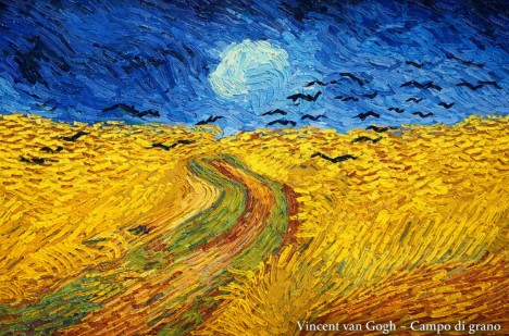 Il tutto potrebbe tradursi nella immagine del “Campo di grano con corvi” di Van Gogh. Il giallo del grano che primeggia è minacciato da corvi di morte sempre in agguato. Il grano di vita non è oggi che una grana da evitare. Nel pedagogico film “La notte di San Lorenzo” fascisti e partigiani si scontrano violentemente nei campi, nascosti tra i covoni, trucidandosi. Uno dei contendenti viene, in una trasposizione immaginaria, trafitto addirittura da una serie di giovellotti. Il commento musicale è il “Dies irae”, non roba da poco.