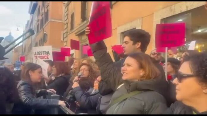 Mostrati cartelli con le scritte “La destra tradisce le donne” e “Senza consenso è stupro”, le manifestanti hanno chiesto alle senatrici: “Escano fuori a difenderci, altre occupino l’aula, è una vergogna”. Tra gli slogan più urlati: “Allerta, allerta, che cammina, lotta transfemminista dalla sera alla mattina. Che tremi, che tremi ogni fascista, oggi Roma è transfemminista”.