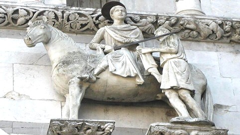 Dice la storia che un giorno del rigido inverno del 335, nei pressi di Amiens, Martino, soldato della guardia imperiale dell’esercito romano, s’imbatté in un poveretto seminudo. Quantunque non cristiano eppur mosso a compassione Martino tagliò un pezzo della sua clamide bianca e la dette a quell’uomo. Altre storie aggiungono che poi incontrando un altro povero, Martino si disfece anche di ciò che gli era rimasto, donandolo a questo secondo mendico.