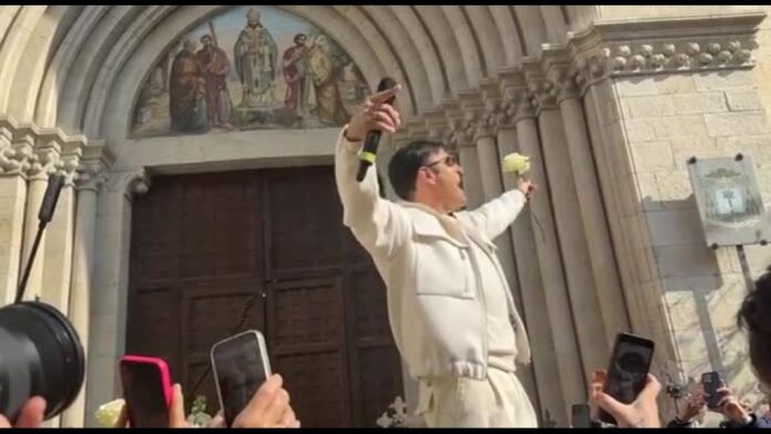 Sanremo, 26 feb. (askanews) – Bagno di folla (e sole) per il cantautore Sal Da Vinci, protagonista di un flash mob con alcuni novelli sposi – che si sono giurati amore eterno – davanti alla Cattedrale di San Siro a Sanremo. L’artista vestito di bianco ha cantato per i presenti “Per me sempre sì”, il suo brano, definito un inno al matrimonio, in gara al 76esimo Festival di Sanremo. Poi ha chiesto a una coppia di convolare a nozze e la risposta di lui è stata “amore ti prometto amore”, lei: “Per me sempre sì”.